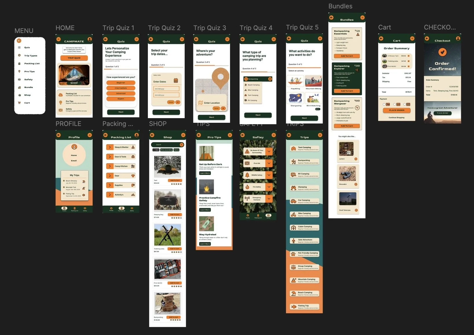CampMate is a mobile app that helps beginner campers plan trips, create packing lists, and find curated gear recommendations. Designed during the Google UX Design Certificate program, this project focused on improving accessibility, clarity, and confidence for new campers.