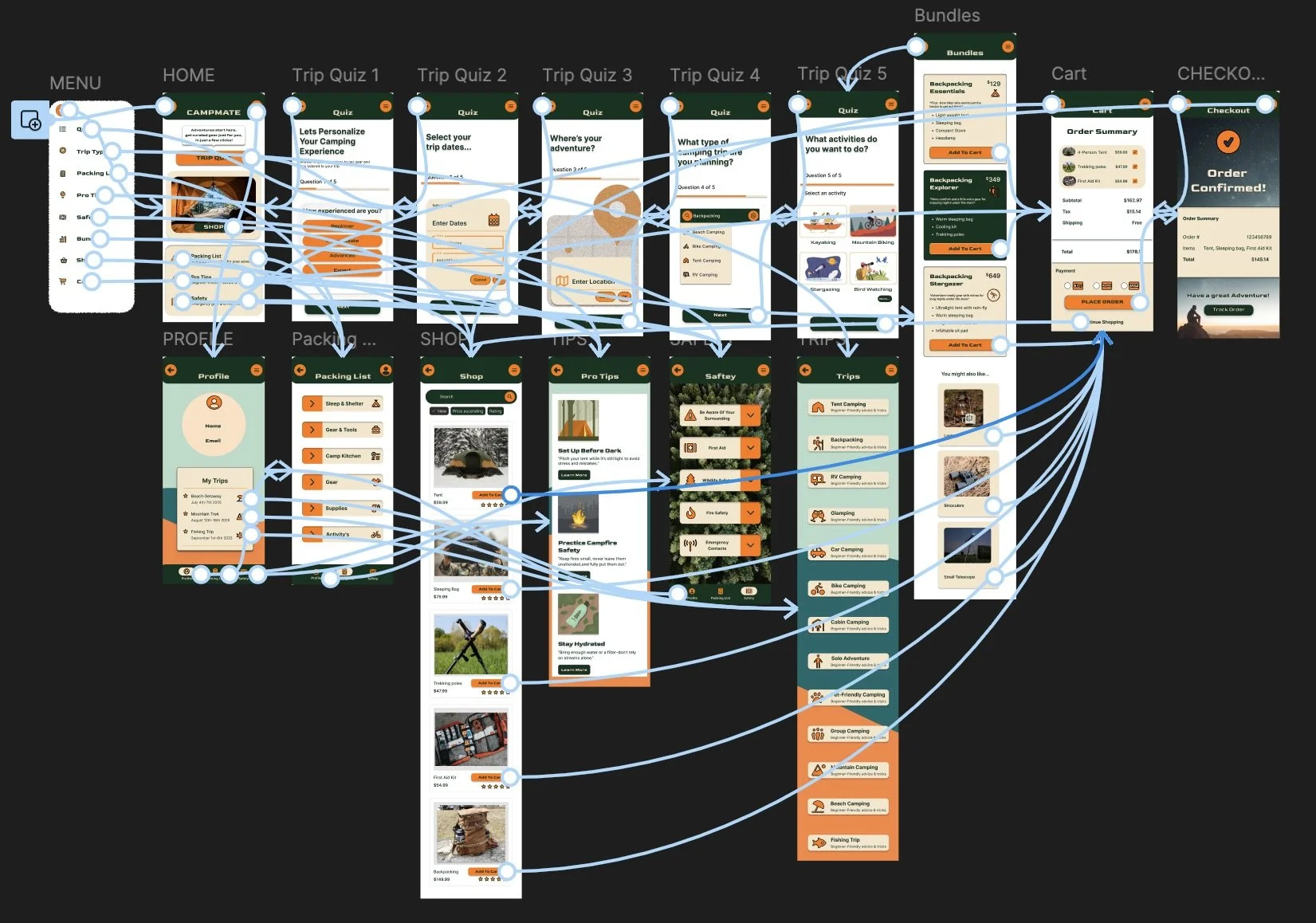 This study explored how beginner campers navigate a responsive camping supply prototype to identify which features improve confidence and ease of use. Insights from this phase informed critical updates to navigation flow, product recommendations, and trip-planning tools before advancing to high-fidelity testing.